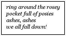 upon further investigation on snopes.com, i learned that this interpretation is most likely a load of over-imaginative, english major bunk. the first written records of ring around the rosey didn't surface until its publication in kate greenaway's mother goose or the old nursery rhymes in 1881. so unless kids were stealthily playing this game on the dl for 500 years, it's unlikely that the rhyme is in reference to the plague. one argument that i read (and liked) explained how perhaps it was a reaction against the religious ban on dancing among protestants in the 19th century. sounds good to me.
